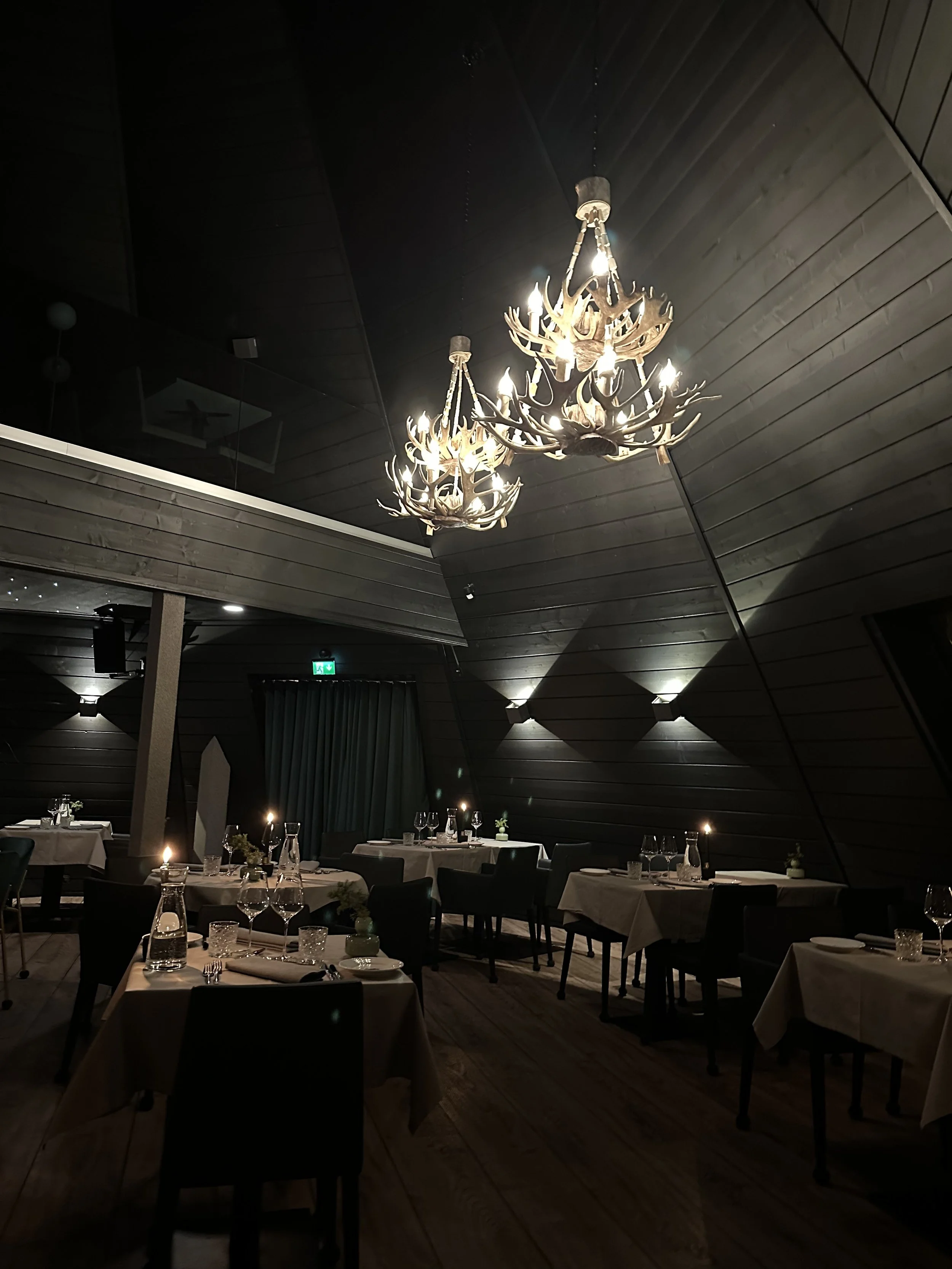 Restaurant Gallis is located inside Glass Resort, in Santa Claus Village. It is intimate, dimly lit, with high ceiling windows looking out to the village.